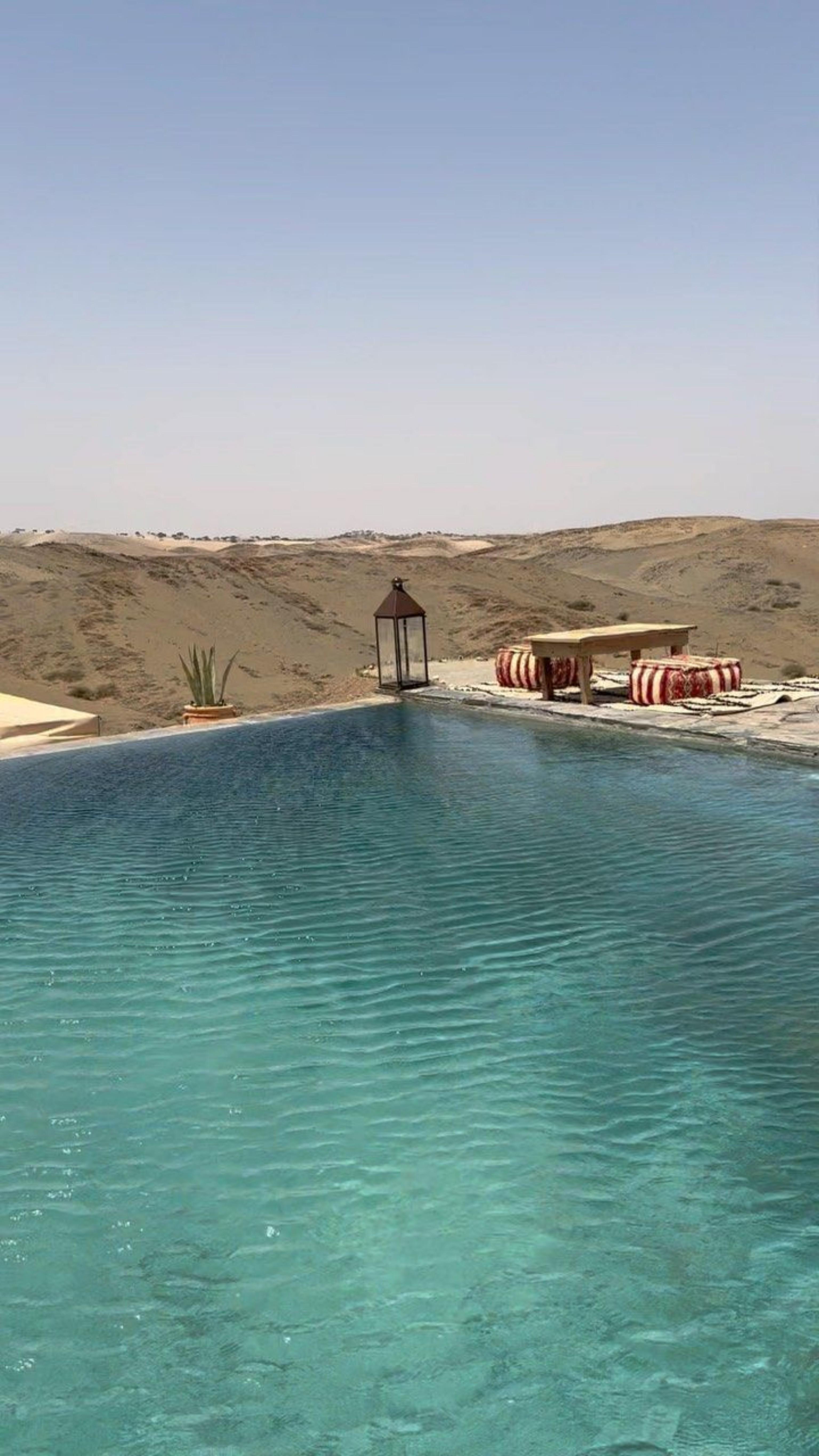 La piscine, c'est la bonne surprise. Installée dans un campement au milieu du désert, elle est parfaite pour se rafraîchir après la poussière du quad. Serviettes fournies, transats disponibles. On peut y rester le temps qu'on veut avant de passer à table.