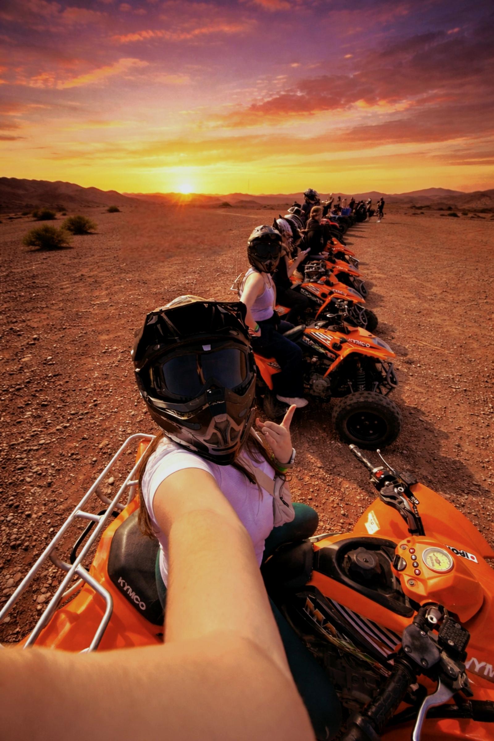 Premiere activite : une heure de quad guide sur les pistes du plateau. Le terrain d'Agafay est plus technique que celui de la palmeraie, avec des passages entre les rochers, des descentes dans des oueds asseches et des montees sur les collines. Le guide ouvre la route et adapte l'allure au niveau du groupe. L'equipement de securite est fourni : casque, lunettes, gants. Les quads sont automatiques. La lumiere de fin de journee rend le paysage encore plus dramatique, avec les ombres allongees et les teintes chaudes.