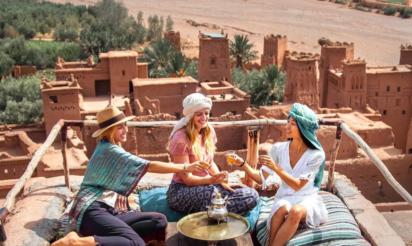 Jour 1 : Marrakech - Telouet - Ait Benhaddou - Ouarzazate. Départ de Marrakech le matin. La route grimpe rapidement vers le Haut Atlas par la nationale 9. Les lacets du col du Tichka culminent à 2260 mètres d'altitude, avec des vues vertigineuses sur les vallées et les villages berbères en contrebas. Le paysage passe des oliveraies de la plaine aux rocailles d'altitude en moins d'une heure, un contraste saisissant.