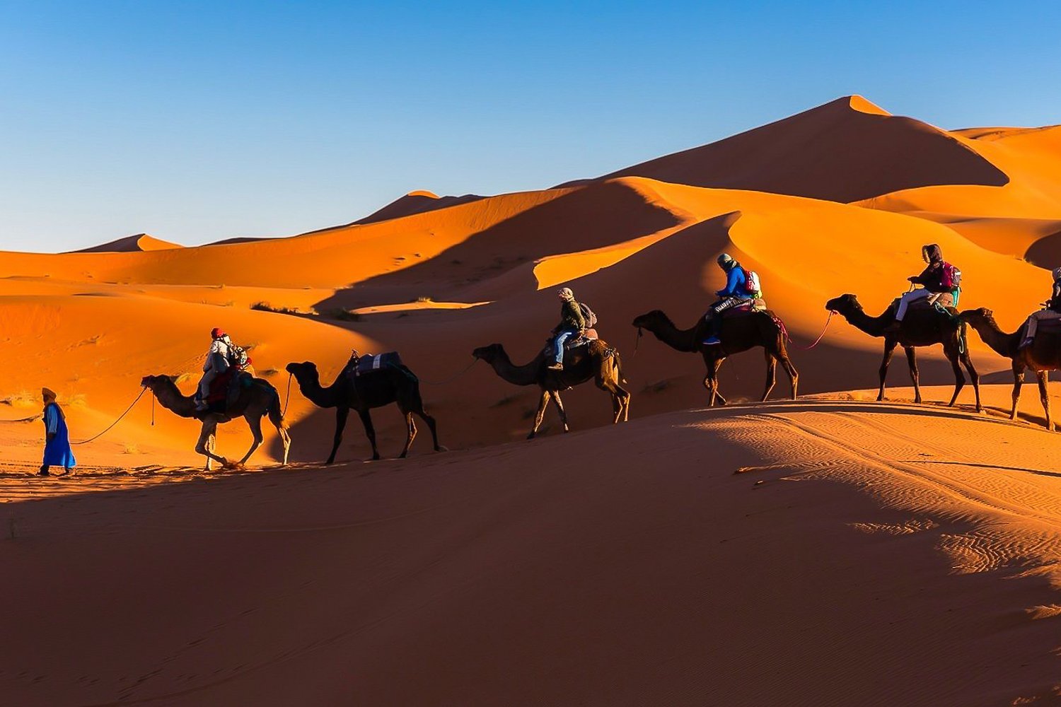 Jour 2 — Les gorges et l'arrivee au Sahara. Direction les gorges du Todra le matin — un canyon de 300 metres de haut ou la route se faufile entre des parois quasi verticales. L'endroit est spectaculaire, surtout quand la lumiere du matin eclaire le sommet des falaises. En prive, le guide adapte le temps de visite a votre rythme. On continue vers l'est, a travers des paysages qui deviennent de plus en plus desertiques : la vallee du Draa avec ses palmeraies, les villages d'Erfoud et Rissani. Arrivee a Merzouga en fin d'apres-midi. Transfert sur des dromadaires pour la traversee des dunes de l'Erg Chebbi — environ une heure de caravane dans le sable, chronometree pour le coucher du soleil. Les dunes culminent a 150 metres et les couleurs au couchant sont extraordinaires.