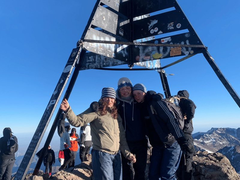 Jour 2 : réveil vers 5h du matin pour attaquer le sommet. La montée finale fait environ 1 000 mètres de dénivelé positif sur un terrain de plus en plus minéral. Éboulis, zigzags serrés, passages rocheux. Le rythme est lent et régulier, le guide adapte les pauses à la condition du groupe. Vers 8-9h, on atteint le sommet. Le panorama est immense : le Haut Atlas s'étend dans toutes les directions, le plateau désertique du Sahara se devine au sud, et par temps dégagé, on aperçoit la silhouette de l'Anti-Atlas voire la côte atlantique.
