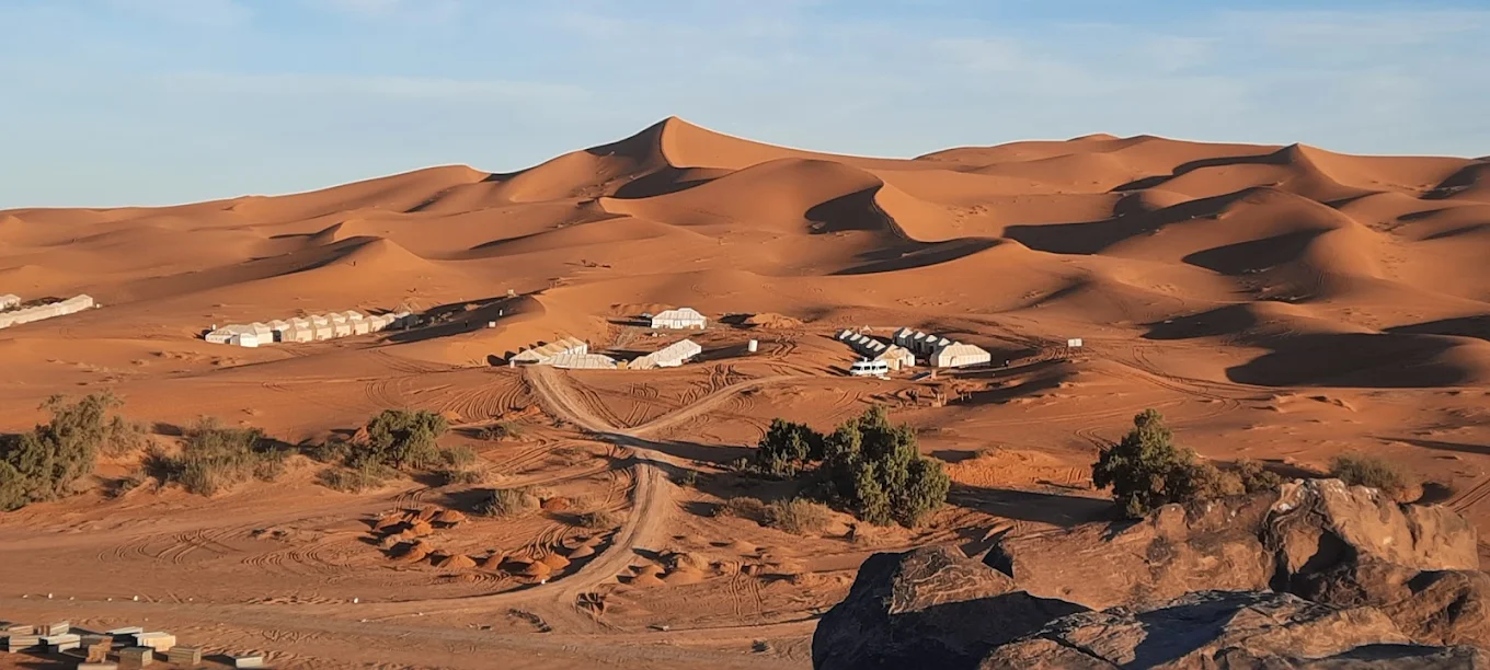 L'arrivee a Merzouga se fait en fin d'apres-midi. Le transfert vers le camp de bivouac se fait a dos de dromadaire, une balade de 45 minutes a 1 heure a travers les dunes dans la lumiere du couchant. Le camp est equipe de tentes, de lits, et d'un espace commun ou le diner est servi. La nuit au bivouac, le silence du desert, le ciel etoile et la musique des guides gnawa autour du feu, c'est le moment que tout le monde retient.