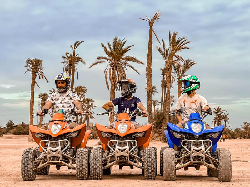 Concrètement, le parcours couvre l'oasis de Marrakech et les pistes qui bordent la palmeraie. On alterne entre des passages rapides sur terrain plat et des sections plus techniques dans le sable. Le guide ajuste le rythme selon le niveau du groupe, ce qui veut dire que ça convient aussi bien aux débutants qu'à ceux qui veulent pousser un peu plus.