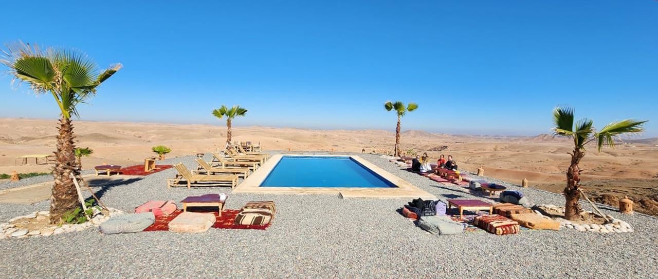 Embarquez pour une balade à dos de chameau dans le désert d'Agafay. Admirez la beauté d'un coucher de soleil unique sur le désert rocailleux de Marrakech, profitez d'une baignade dans le désert et d'un repas traditionnel.