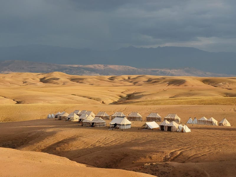 Découvrez le désert marocain sans vous rendre au Sahara. Rendez-vous dans le désert d'Agafay, situé juste à l'extérieur de Marrakech, et profitez d'une promenade à dos de chameau au coucher du soleil et d'un dîner typiquement marocain.