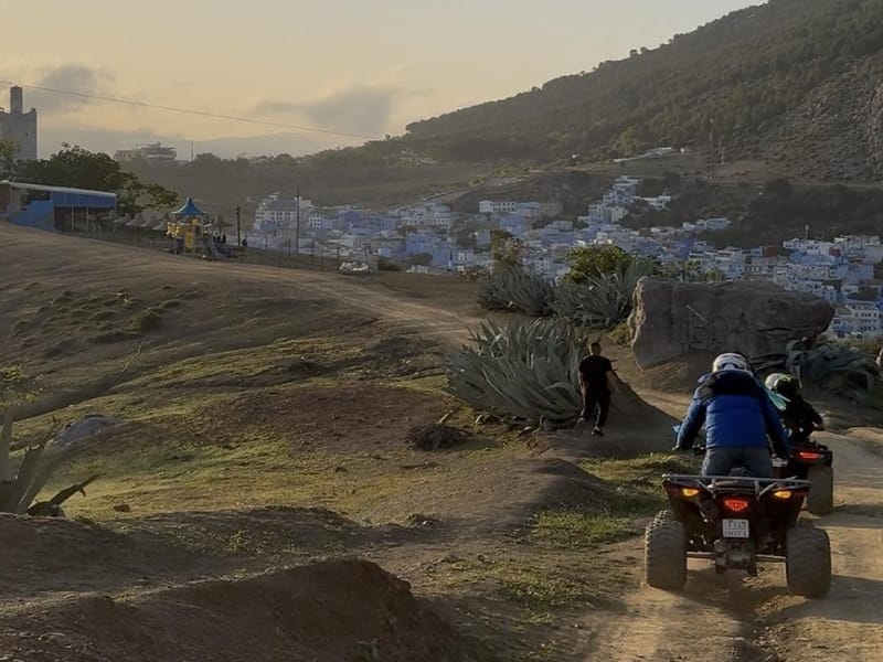On démarre depuis Chefchaouen et on attaque les collines environnantes. Les pistes grimpent vite, les lacets se succèdent, et à chaque virage la vue s'élargit un peu plus. La ville bleue se dévoile en contrebas — un patchwork de murs azur, de toits en tuile et de minarets blancs encaissé dans la vallée.
