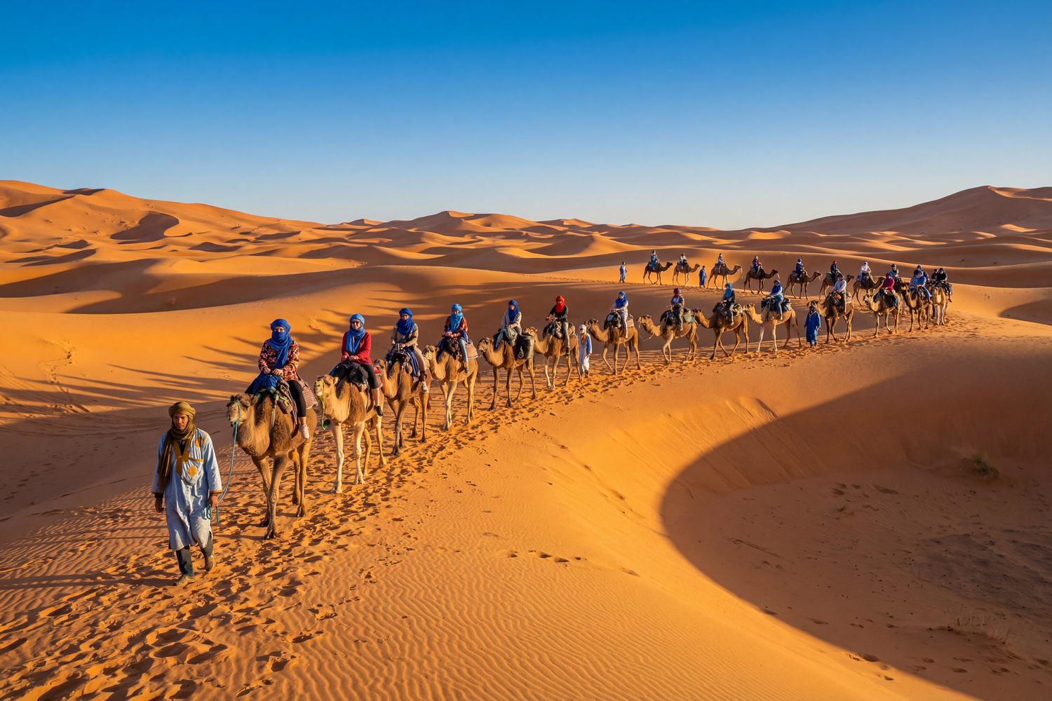 Monter sur un dromadaire pour la premiere fois, ca surprend. Ca monte par l'arriere d'abord, puis par l'avant — accrochez-vous. Apres, on s'habitue vite au balancement. Le chamelier connait ses betes par leur prenom et les guide sans effort. La balade dure en general une demi-heure, parfois plus au coucher du soleil.