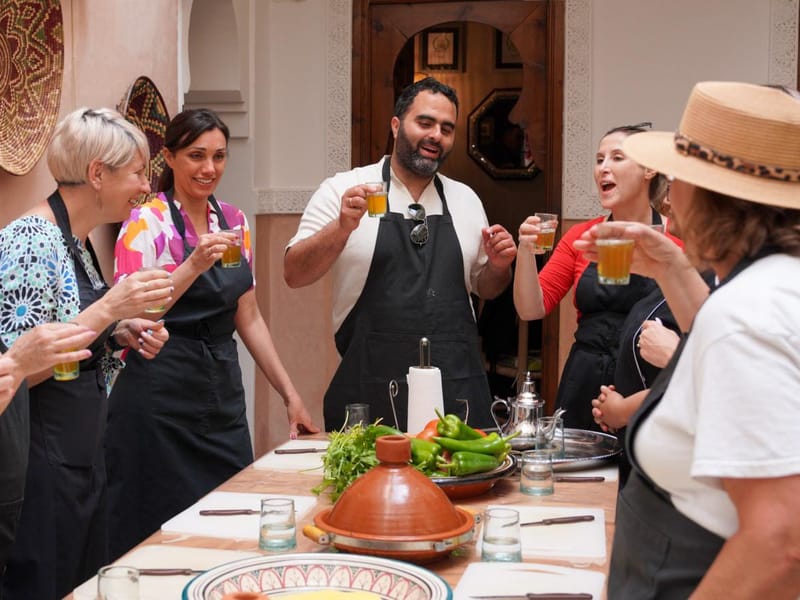 Ce cours de cuisine marocaine a Marrakech se deroule chez Aicha, une chef berbere qui a passe sa vie entiere a cuisiner les plats traditionnels du Maroc. Pas un restaurant, pas un hotel : une vraie maison marrakchie avec son patio, ses mosaiques et son odeur permanente d'epices.