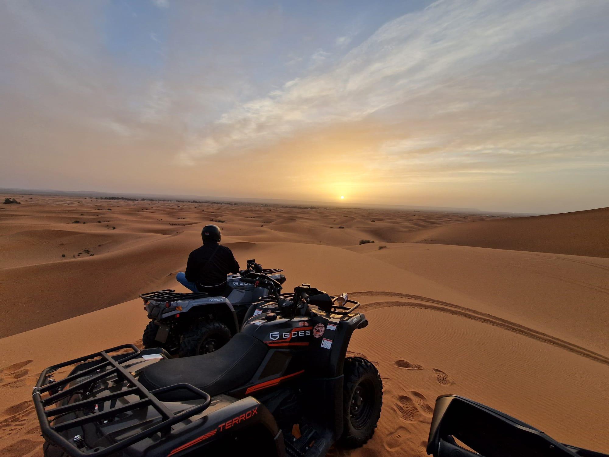 Jour 6 : Erfoud - Merzouga. Courte route jusqu'a Merzouga. Transfert en 4x4 dans les dunes de l'erg Chebbi. Balade a dos de dromadaire jusqu'au campement. Diner sous les etoiles avec musique gnaoua. Nuit en tente berbere.