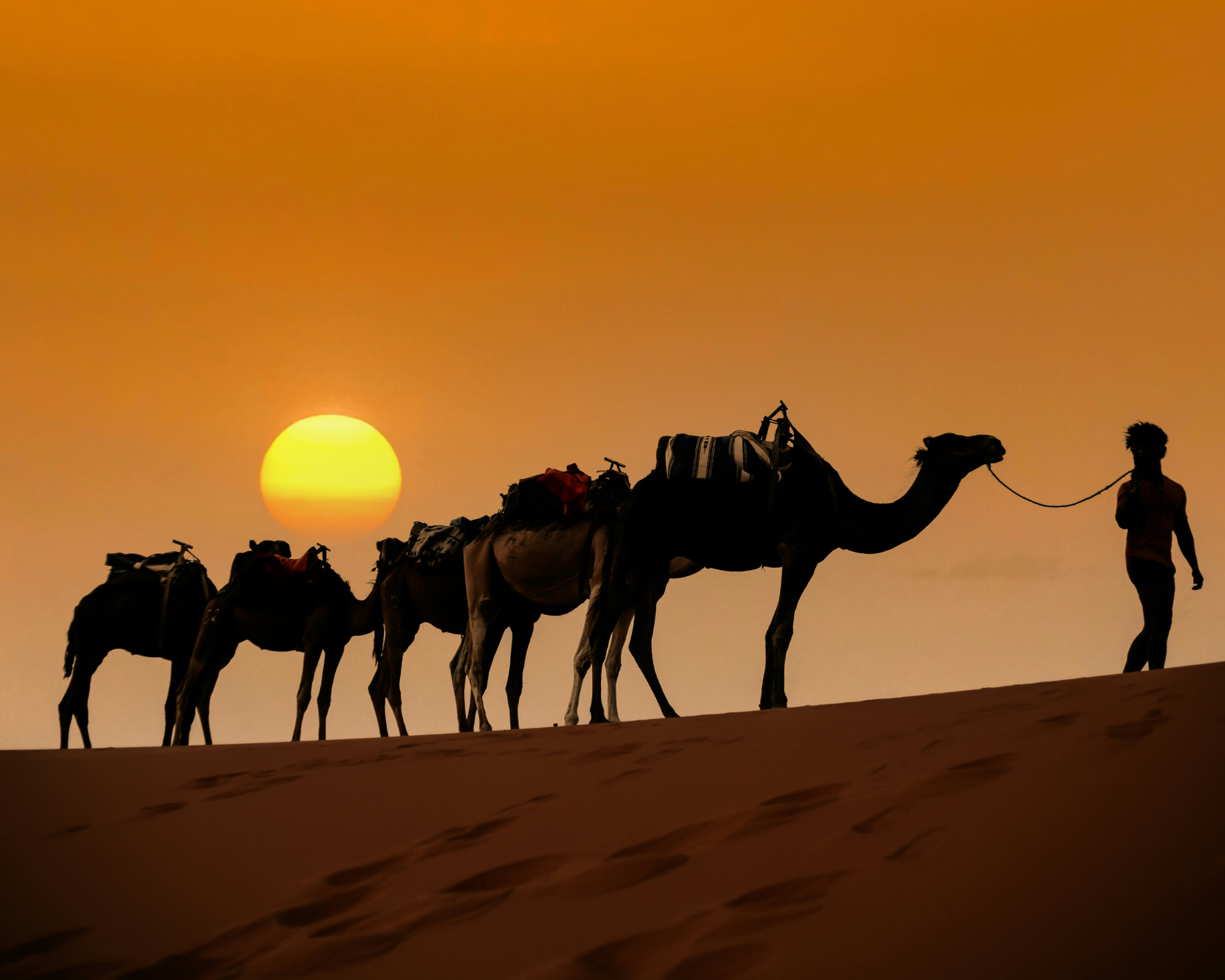 Monter sur un dromadaire pour la premiere fois, ca surprend. Ca monte par l'arriere d'abord, puis par l'avant — accrochez-vous. Apres, on s'habitue vite au balancement. Le chamelier connait ses betes par leur prenom et les guide sans effort. La balade dure en general une demi-heure, parfois plus au coucher du soleil.