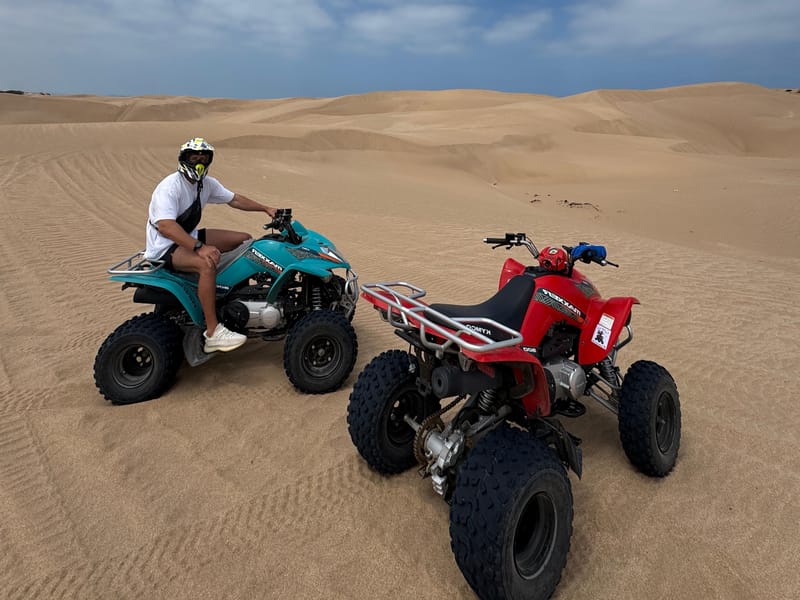 Le depart se fait depuis un point de rendez-vous pres d'Essaouira. Apres le briefing et la distribution des equipements (casque, lunettes), le guide prend la tete du convoi. Direction sud, vers le cap Sim. Les premiers kilometres traversent une zone de dunes — du sable dore, pas trop haut, parfait pour s'echauffer et prendre le feeling du quad.