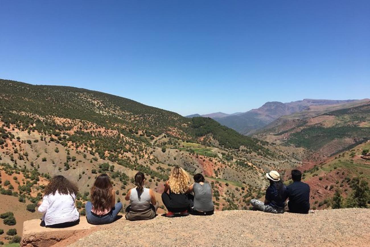 Le depart se fait le matin depuis votre hebergement a Marrakech, transport inclus. La route S513 remonte la vallee en longeant l'oued Ourika. Le paysage se transforme rapidement : les plaines seches cedent la place a des terrasses cultivees, des villages en pise accroches aux pentes, des vergers de noyers et de cerisiers. Le guide, originaire de la region, commente le trajet et explique l'organisation sociale des communautes berberes de l'Atlas : les systemes d'irrigation traditionnels, le role du chef de village, les fetes saisonnieres.