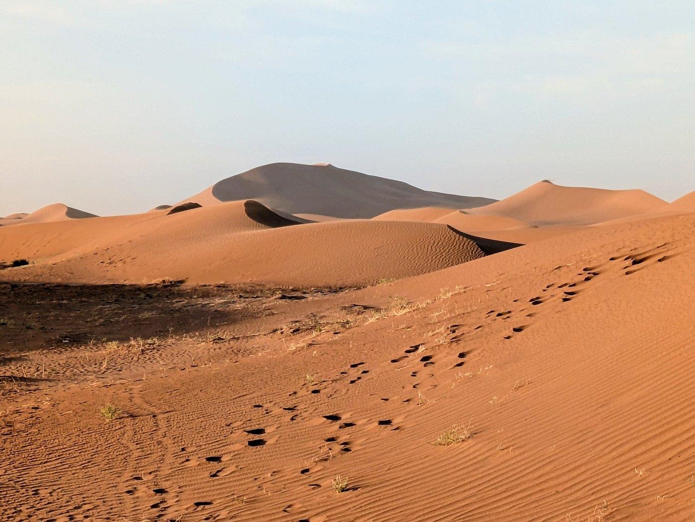On dort dans le desert. Pas dans un hotel avec vue sur le desert — dans le desert, sous les etoiles, avec le sable qui crisse quand on marche la nuit. Le camp est amenage : tentes, matelas, couvertures. Le diner arrive en tajine sur le feu. Le matin, le soleil se leve sur les dunes et ca vaut toutes les photos Instagram du monde.