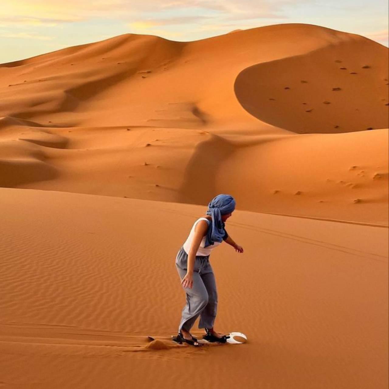 Le Moyen Atlas et le desert. La route traverse Ifrane (forets de cedres, singes magots), puis descend vers Erfoud et Merzouga. Le paysage change du tout au tout en quelques heures. Arrivee aux dunes de l'erg Chebbi, transfert en 4x4 ou a dos de dromadaire jusqu'au camp. Nuit en bivouac dans le Sahara, diner sous les etoiles, lever du soleil sur les dunes. C'est le moment qui coupe le souffle, meme chez les voyageurs les plus experimentes.