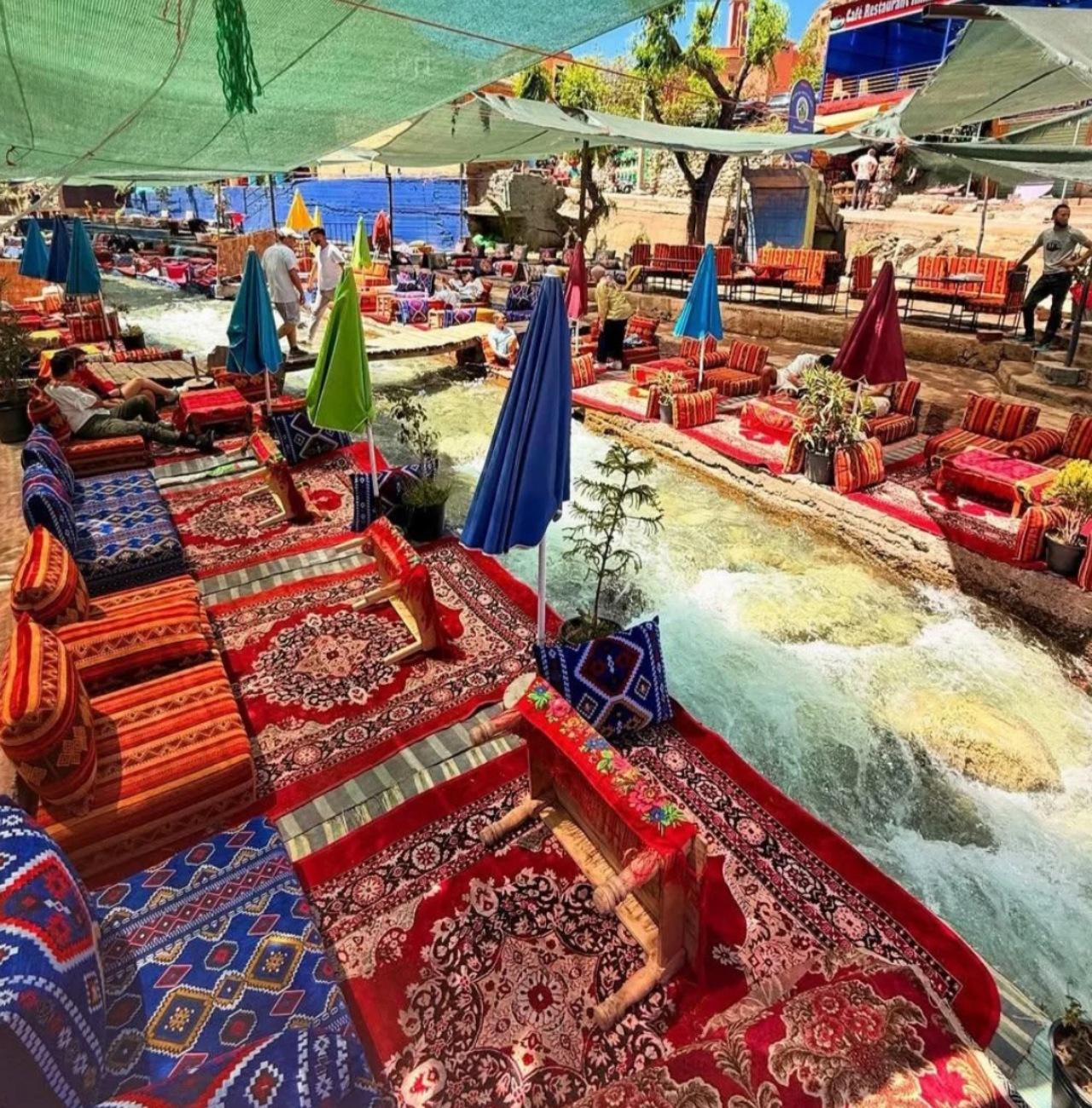 Le dejeuner au bord de la riviere est un des temps forts de la journee. Plusieurs restaurants rustiques a Setti Fatma ont installe des banquettes et des tables directement sur les rochers de l'oued. On mange avec le bruit de l'eau en fond sonore, les pieds a quelques centimetres du courant. Le menu type : salade marocaine, tajine (poulet ou kefta le plus souvent), pain, fruits de saison, the a la menthe. La cuisine est simple, fraiche, preparee avec les produits du coin.
