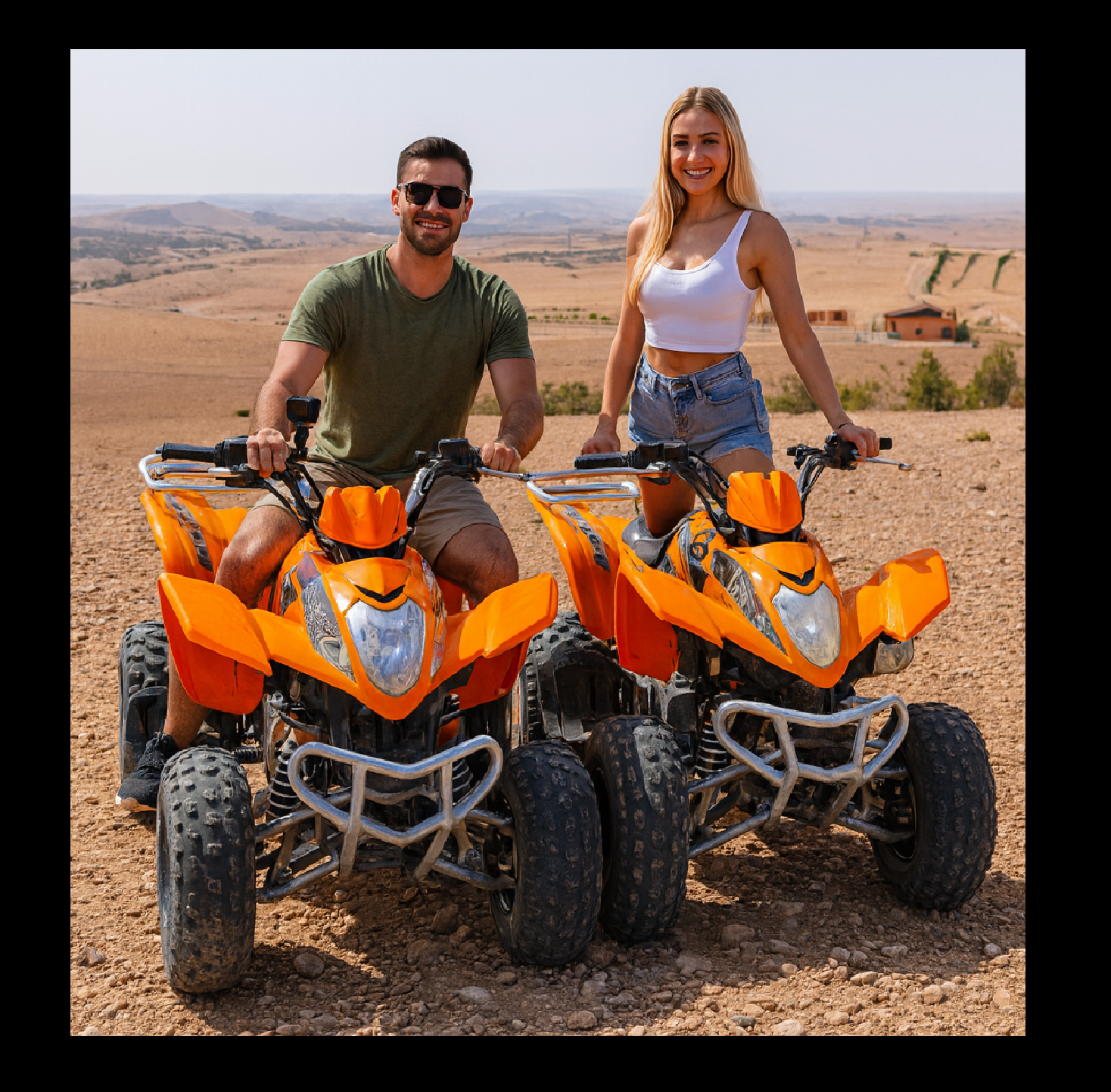 Premiere activite : le quad. Apres un briefing securite et la distribution des casques, on part sur les pistes du desert pour environ une heure de ride. Les quads sont automatiques, donc accessibles meme aux debutants. Les sentiers alternent entre portions plates ou l'on peut accelerer et passages vallonnes avec des montees et des descentes techniques. La poussiere fait partie du jeu — les lunettes de protection sont fournies. Le paysage autour est lunaire : terre ocre et grise, cailloux, quelques buissons seches, et au loin les sommets de l'Atlas qui culminent a plus de 4000 metres.