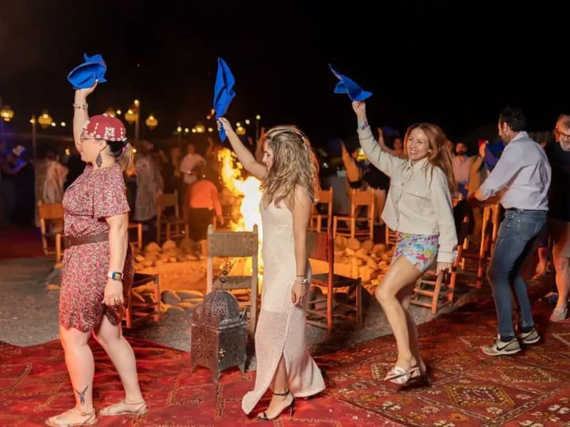 Cette soiree combine trois elements dans un meme lieu : un diner marocain traditionnel, de la musique live et un spectacle de feu, le tout dans le cadre singulier du desert d'Agafay a proximite de Marrakech.