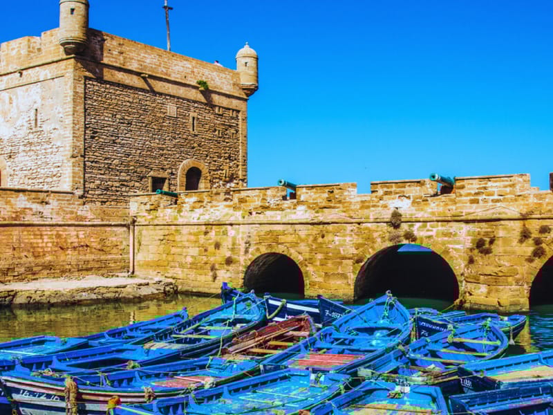 Arrivee a Essaouira vers 11h en general. La visite commence par le port de peche, un des plus actifs de la cote atlantique marocaine. Les chalutiers bleus sont amarres les uns contre les autres, les pecheurs debarquent les prises du jour, et les mouettes font un raffut monstre. Juste a cote du port, des etals de poisson grille proposent des assiettes enormes de sardines, crevettes, calmars et poisson du jour pour des prix tres corrects.