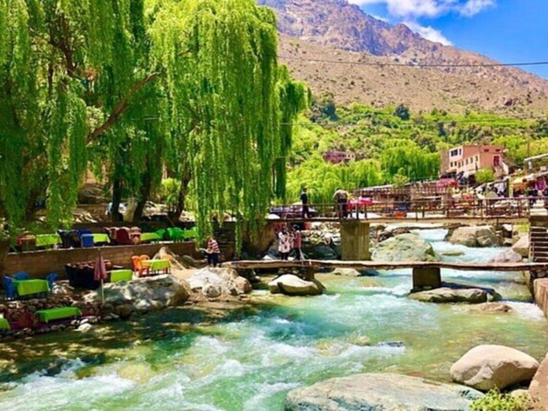 La vallee de l'Ourika est l'echappee belle la plus populaire au depart de Marrakech, et pour cause : en moins d'une heure de route, on passe du climat semi-aride de la plaine du Haouz a un micro-climat montagnard ou coulent des rivieres et poussent des arbres fruitiers. L'excursion demarre le matin a votre hebergement marrakchi.