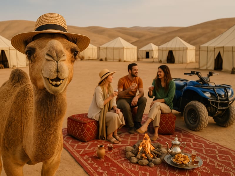 Découvrez notre forfait Désert d'Agafay depuis Marrakech, comprenant une balade à dos de chameau au coucher du soleil, un dîner-spectacle berbère authentique et un spectacle de feu. Prise en charge gratuite et visite de la coopérative d'argan.