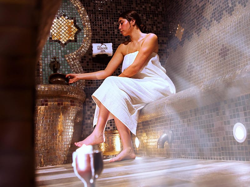 Premiere etape : la salle chaude. On entre dans une piece carrelee, chauffee a environ 40-45 degres, avec une forte humidite. On s'installe sur le marbre chaud et on laisse la vapeur ouvrir les pores pendant 10 a 15 minutes. C'est le moment ou le corps se prepare au gommage. La chaleur detend les muscles en profondeur et la vapeur ramollit la couche superficielle de la peau.