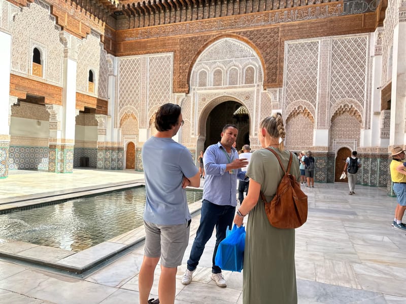 Marrakech d'abord. L'hebergement est dans un riad de charme dans la medina — les meilleurs ont des cours avec fontaines, des suites avec cheminee, des terrasses avec vue sur les toits et le minaret de la Koutoubia. Le guide organise des visites privees aux heures creuses : palais Bahia a l'ouverture quand il est quasi vide, tombeaux Saadiens en fin de journee quand les groupes sont partis, medersa Ben Youssef avec un eclairage de fin d'apres-midi qui sublime les stucs.