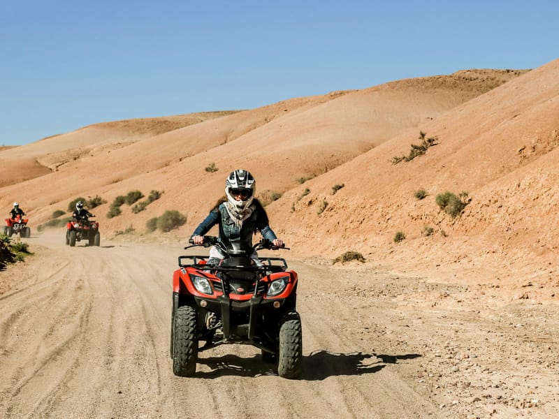 Côté pratique, tout est inclus sauf les pourboires : transfert aller-retour depuis votre hôtel à Marrakech, casque, briefing sécurité et guide. Les quads sont automatiques, 250cc, adaptés aux débutants comme aux pilotes confirmés. Chaussures fermées obligatoires, lunettes de soleil fortement recommandées.