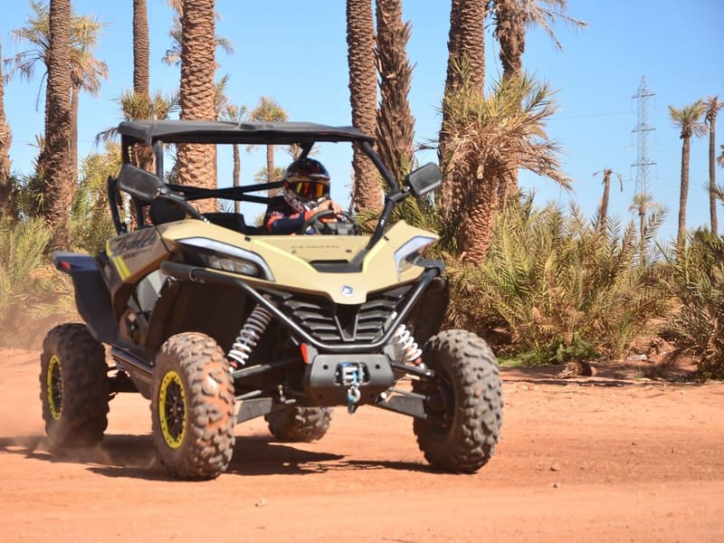 Le buggy, c'est comme le quad mais avec un volant et un siege. Plus stable, plus facile pour les debutants. Le parcours passe par des pistes sablonneuses et pierreuses — ca secoue, mais c'est le but. Briefing avant le depart, casque fourni.