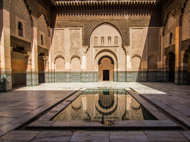 La medersa Ben Youssef est le joyau du parcours. Fondee au XIVe siecle, agrandie au XVIe par les Saadiens, c'est la plus grande ecole coranique historique du Maghreb. Elle pouvait accueillir jusqu'a 900 etudiants dans ses 132 cellules reparties autour de cours interieures.