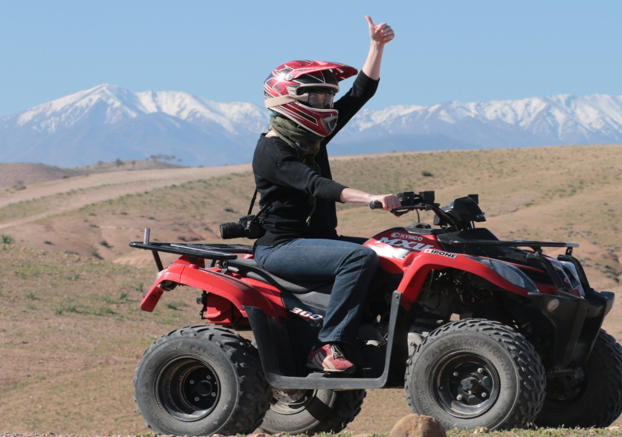 Arrivee au camp de base. On recoit un briefing sur le maniement du quad : acceleration au pouce droit, frein a main, technique dans les virages et les descentes. Les quads sont des 250cc automatiques — pas de boite de vitesses, pas de permis special necessaire. Chaque participant conduit son propre quad (passagers possibles pour les enfants ou ceux qui preferent ne pas conduire). Equipement fourni : casque, lunettes de protection, foulard pour la poussiere.