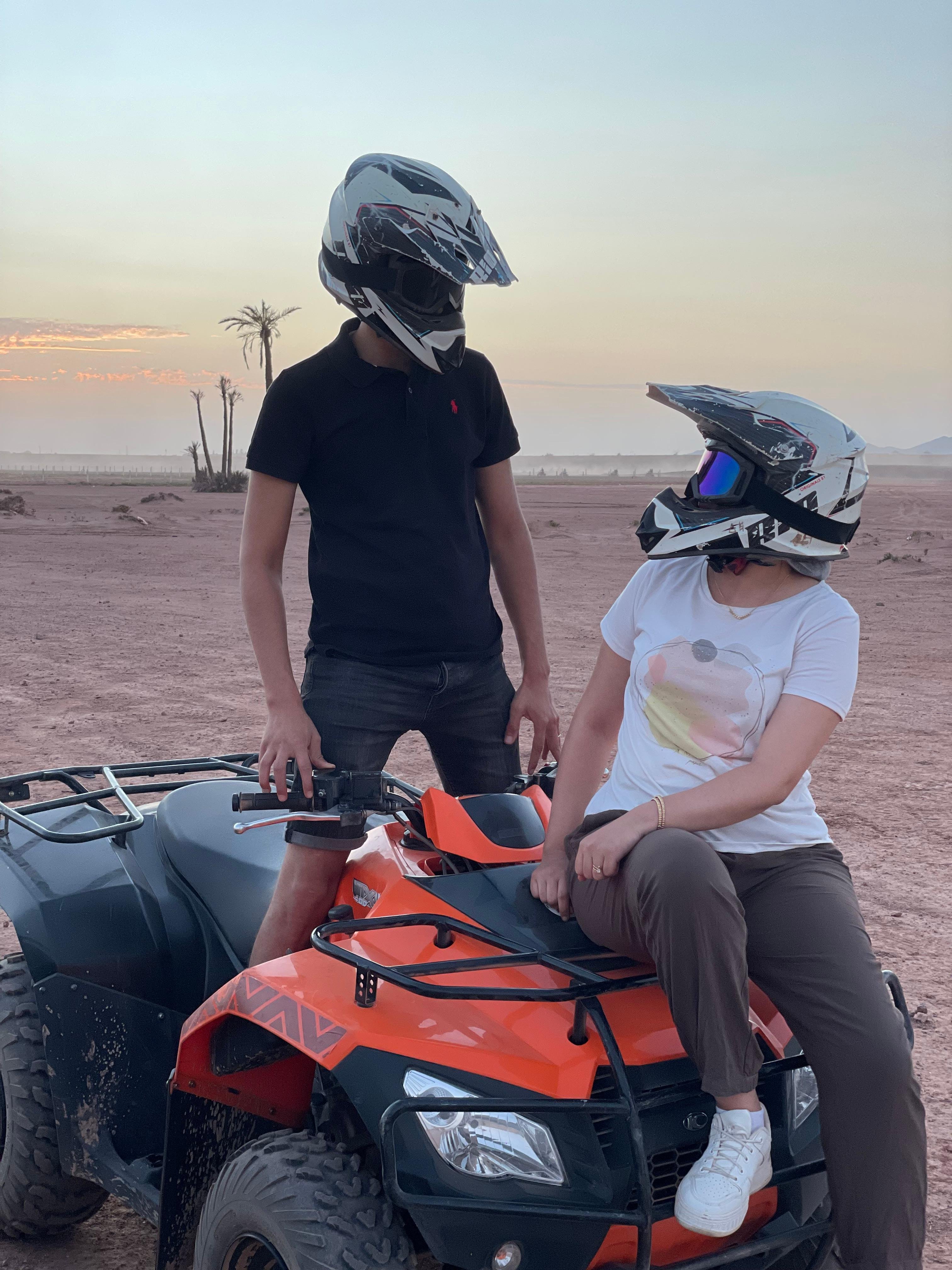 Les quads sont bien entretenus. C'est important de le mentionner parce que ce n'est pas le cas partout à Marrakech. Ici, les machines sont récentes, les freins fonctionnent, les pneus sont en bon état. On porte un casque — obligatoire — et des lunettes de protection sont fournies si vous n'avez pas les vôtres.